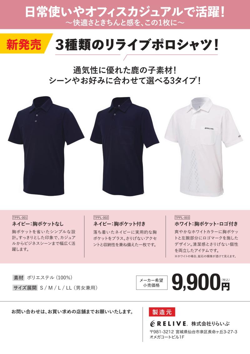 ついにリライブに3種類のポロシャツが新登場!日常使いやオフィスカジュアルで活躍!通気性に優れた鹿の子素材を使用し、シーンやお好みに合わせて選べる3タイプ!詳しくはお問合せください。
